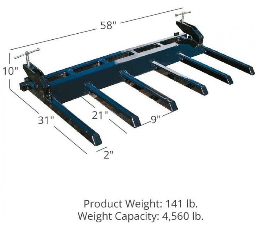 • DIMENSIONS: The 141-pound Clamp-On Debris Fork provides and overall width of 58-inches-wide. The perfect size to fits on a 60-inch bucket. There are five total forks that are 21-inches-long with a fork spacing of 9-inches. The overall depth is 31-inches.