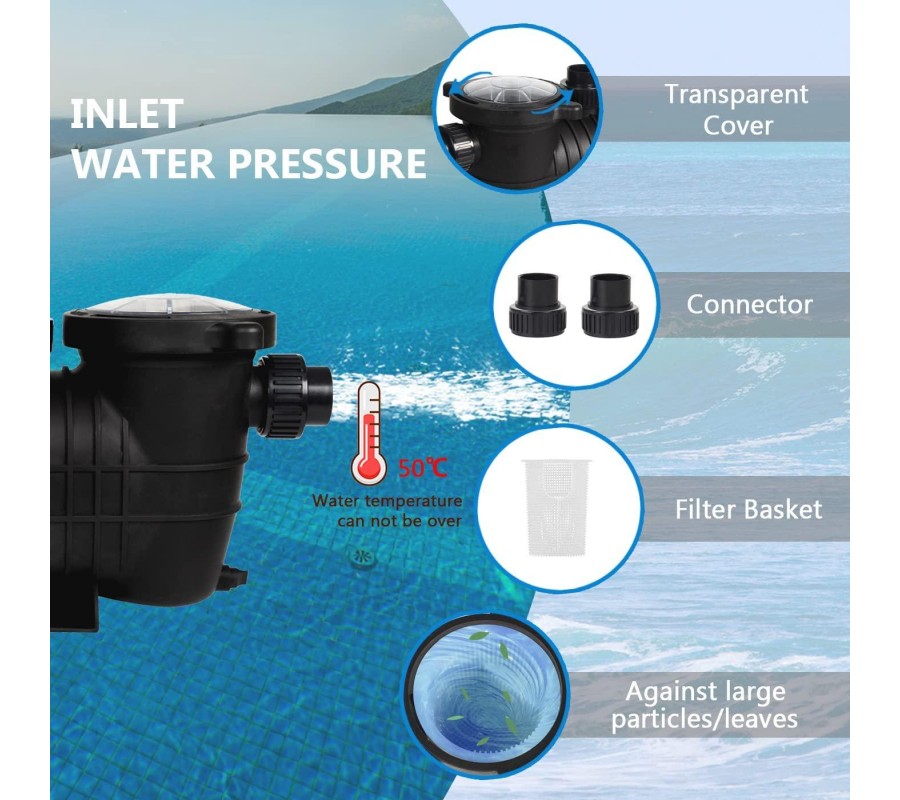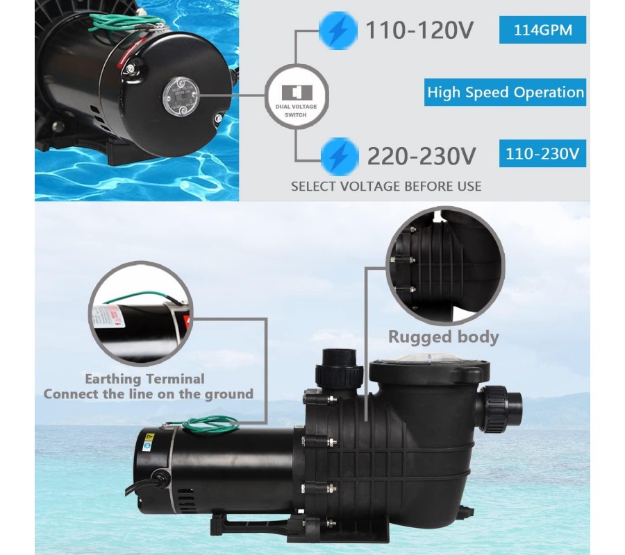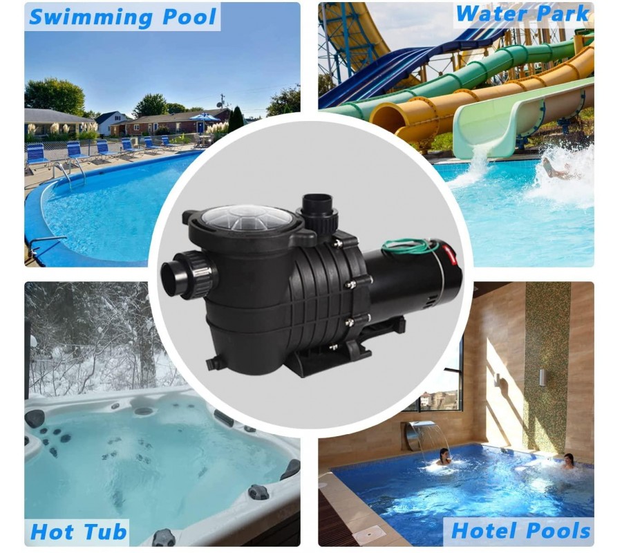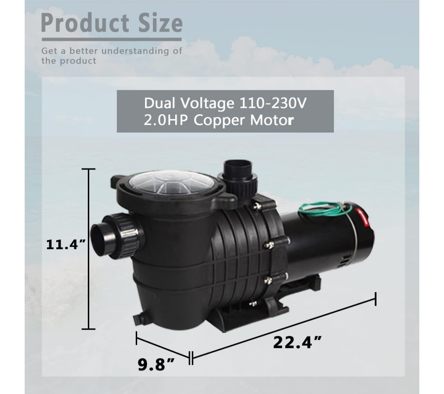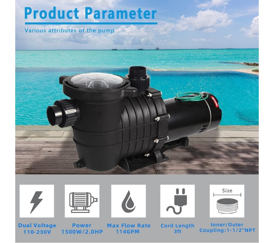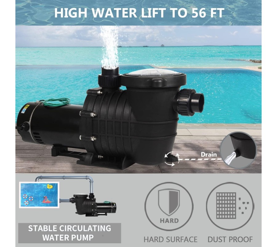 - 【POWERFUL SWIMMING POOL PUMP】The swimming pump has professional powerfull 2.0HP pure copper motor which is more efficient than ordinary 1HP/1.5HP swimming pool pump.Max 6840 Gallon Per Hour rating tackles huge draining job at a fraction of the time.