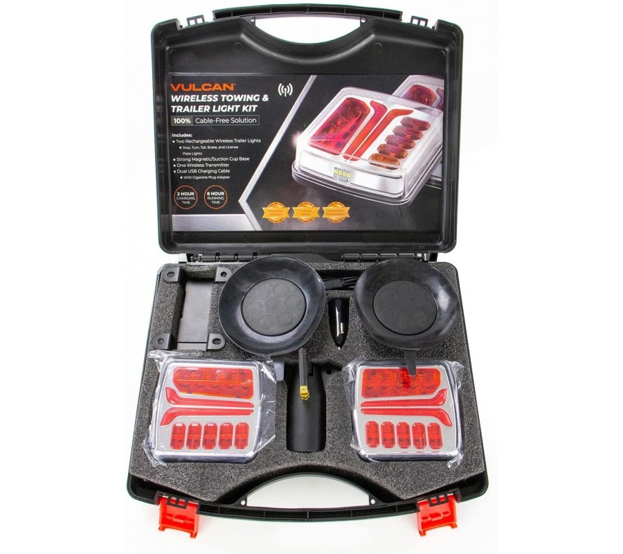 • COMPLETE WIRELESS TRAILERING AND TOWING KIT – Easy to use and installs in seconds. Includes two wireless, rechargeable trailer lights, two vertical and horizontal mount brackets, heavy duty magnets with suction cups, one 7-wire blade transmitter, dual USB charging cable to charge both lights at the same time, USB cigarette plug adapter and a sturdy, convenient carrying case. Tow with confidence, this tow light kit is backed by the industry expertise that only Vulcan can provide.